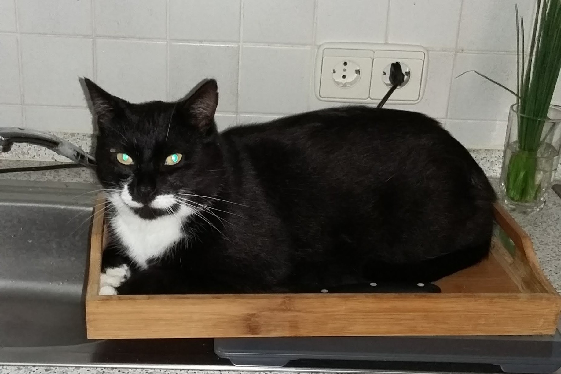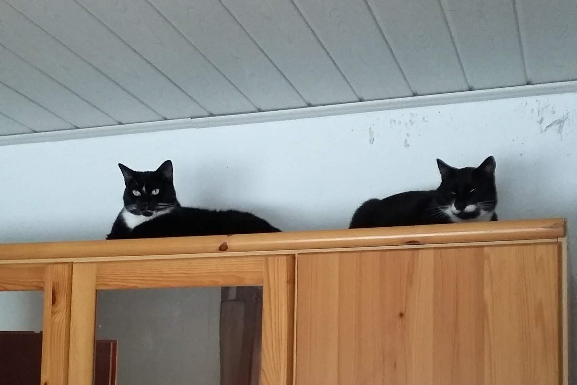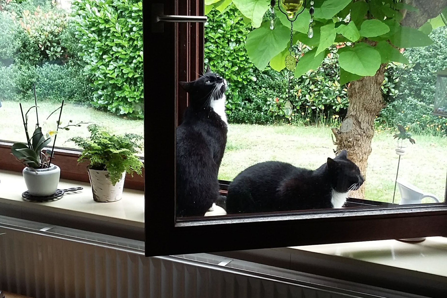 Merlin ist zutraulich, Mona anfangs scheu. Beide sind Freigänger aber auch sehr gerne drinnen, wie sie wollen. Sie sind gewöhnt an eine Katzenklappe.