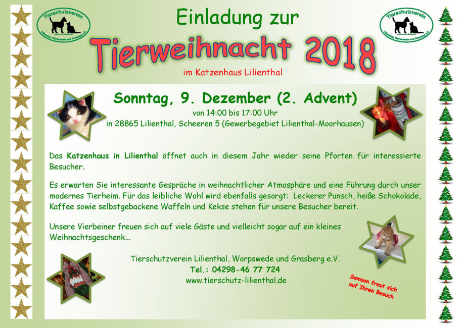 Im Grunde fehlen uns die Worte für das, was wir am vergangenen Sonntag, den 09. Dezember auf der Tierweihnacht im Katzenhaus Lilienthal erleben durften. Mindestens 300 Besucher haben diese Veranstaltung zu einem echten Highlight für den Verein, für alle ehrenamtlichen MitarbeiterInnen und für die Tiere gemacht.