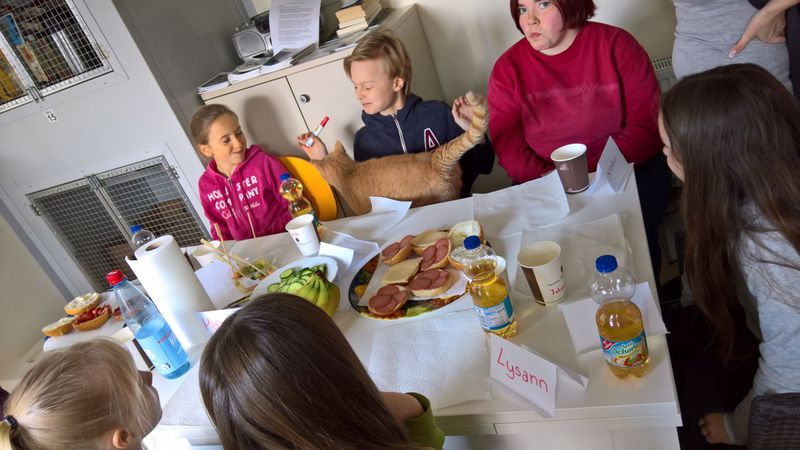 Danach setzten wir uns gemütlich zum Frühstück zusammen. Jennifer sprach dabei über die Aufgaben und Ausbildung eines Tierpflegers. Dessen Aufgaben bestehen neben der Betreung und Pflege der Tiere zu einem großen Teil auch aus Reinigungsarbeiten der Tierunterkünfte. Das wurde dann auch gleich in die Praxis umgesetzt. Unter Anleitung von Renate und Jennifer wurden dann noch die Katzentoiletten und Boxen gereinigt. Dabei kam das Streicheln und Schmusen unserer Katzen natürlich nicht zu kurz.