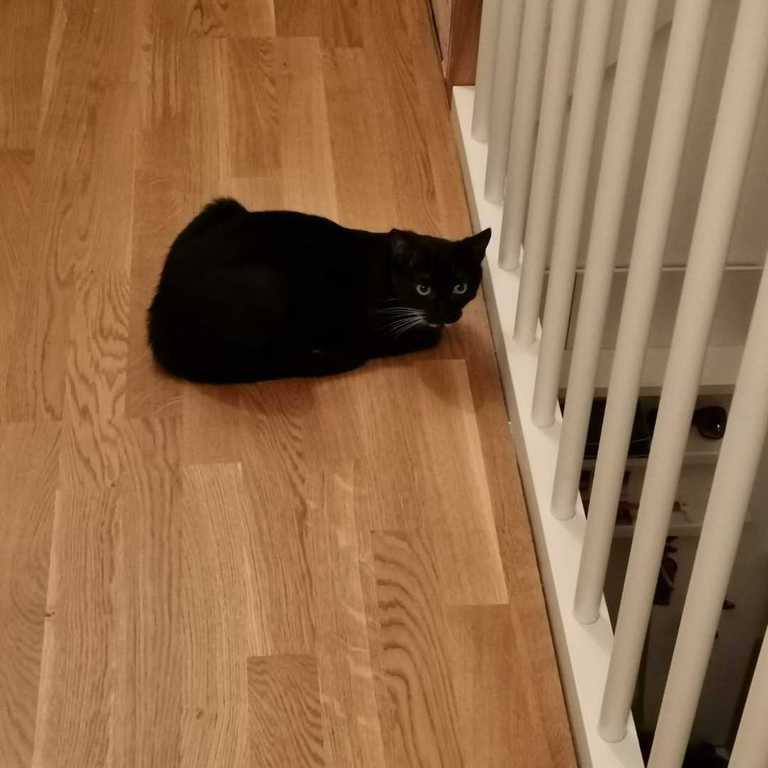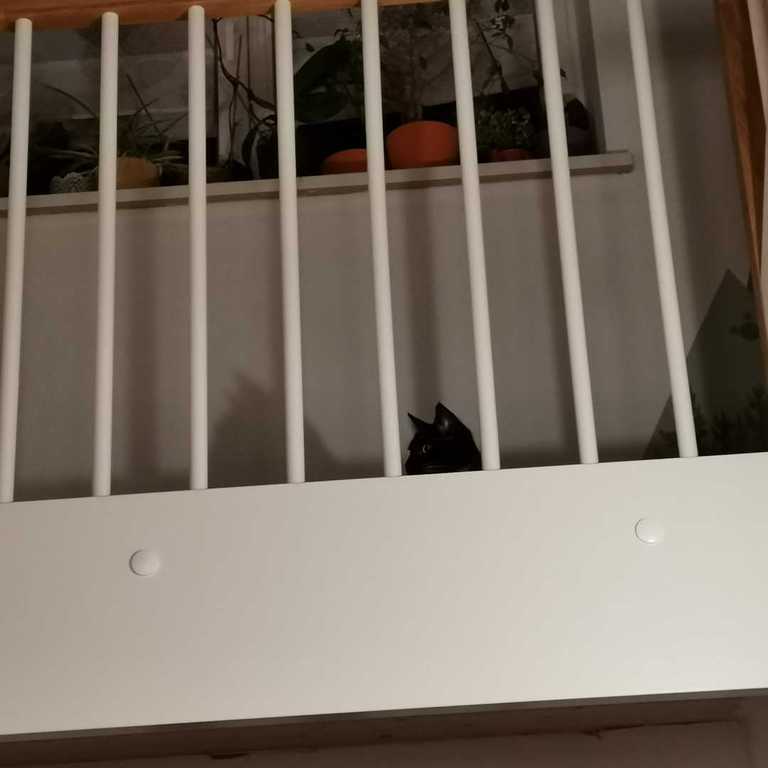 Die Kleine hat ihren Lieblingsplatz oben an der Treppe, von dort aus beobachtet sie alles was so vor sich geht.