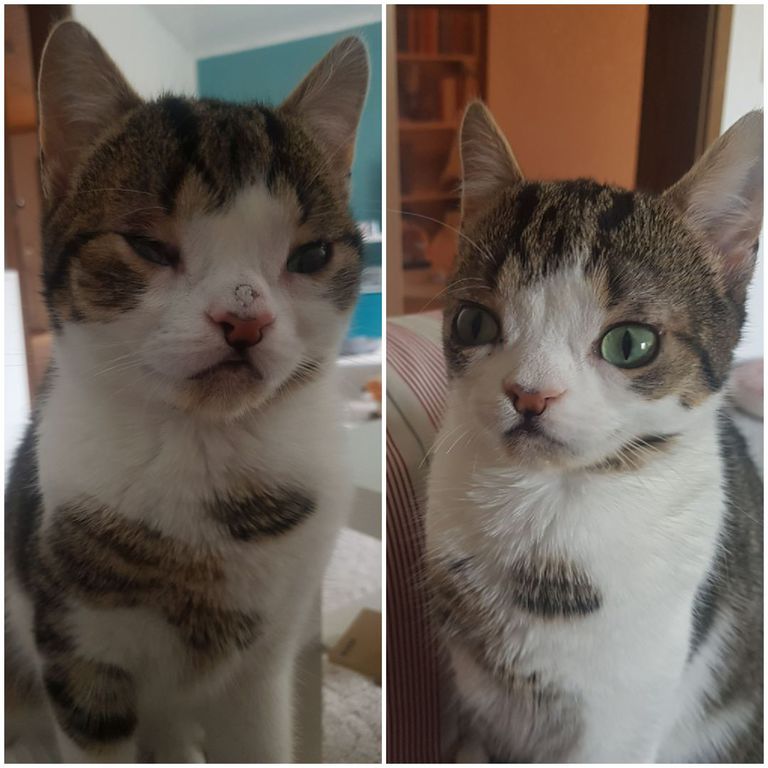 Im März 2020 sind dann Kathrin Schoof und Melanie mit zu einem Tierazrt nach Bramsche gefahren, dort hatten die schon öfter Katzen mit Hydrocephalus (Wasserkopf). Ich durfte/musste auch zum Chefarzt – der hat gesagt, weil ich keine neurologischen Ausfälle habe, muss nicht operiert werden, also keine Narkose und kein MRT!