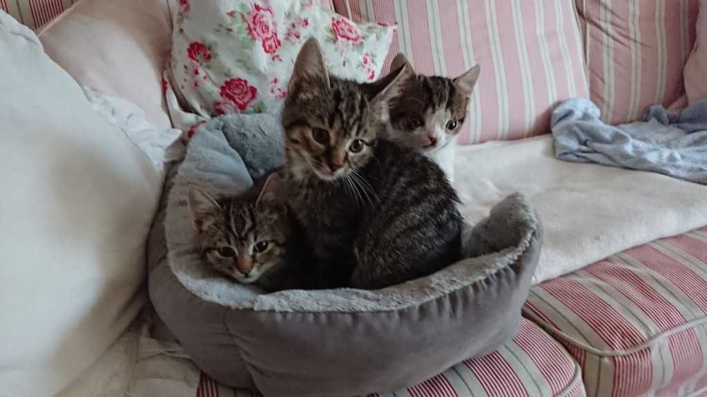 Beim Tierarzt in Worpswede wurden wir untersucht und weil ich eine etwas andere Kopfform habe, zu groß für den restlchen kleinen Körper und schiefe, rausstehende kleine Augen, wurde ein Ultraschall gemacht – Verdacht auf Hydrocephalus (Wasserkopf). Der Tierarzt hatte keine großen Hoffnungen, erstens weil es nicht so oft bei Katzen vorkommt – eher bei Hunden, und weil die Heilungschancen nicht die größten sind. Man kann es operieren, aber eine Chance, dass das hilft, gibt es nicht. Aber ich bin eine Kämpferin! Nachdem wir eine Weile beim Tierarzt waren, sind wir drei zu Kathrin und Sven gezogen, ab da hatten wir auch Namen: wir sitzen in der Reihe auf dem Foto: mein Bruder heißt jetzt Buddy, meine Schwester Lulu und ich heiße ab sofort Loomi.