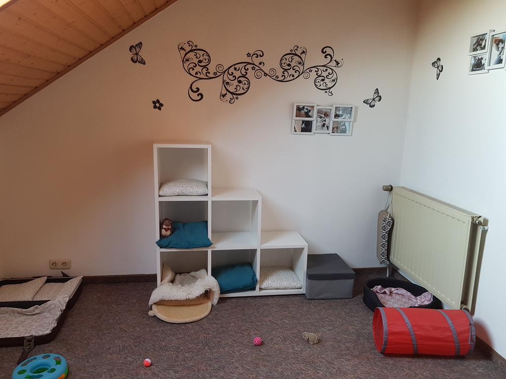 Unser neues hat Teppich, ist zwar etws kleiner, aber recht gemütlich. Wir haben Fotos von uns an der Wan, ein paar Verstecke, ein Katzenklo, Spielzeug, eine Box mit Deckel (dort ist mehr Spielzeug drin, da bedienen wir uns ab und zu), was bequemes zum Schlafen, meine Schwester Lulu schubbert sich unter die Decke auf dem Sessel, ist wohl bequem, aber vor allem dunkel.