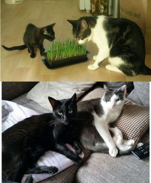 Dann kam der große des Tag des Um-/Einzugs. Spike, das ist der Kater rechts am Katzengras, guckte zwar ein wenig komisch wer denn dieses kleine, quirlige schwarze Monster ist. Aber er war von Anfang an sehr freundlich zu mir. Da er schon ein wenig älter war, wollte er nicht mehr so viel spielen. Aber das war mir egal, ich habe ihn einfach ganz viel geärgert und sowieso war irgendwie alles in der Wohnung für mich ein Spielzeug. Ich habe dann schnell den Posten der Chefin übernommen was für Spike ok war, da er ein sehr ruhiger, gelassener Kater war. Ich glaube manchmal habe ich ihn aber ganz schön genervt mit meinem Gezicke…