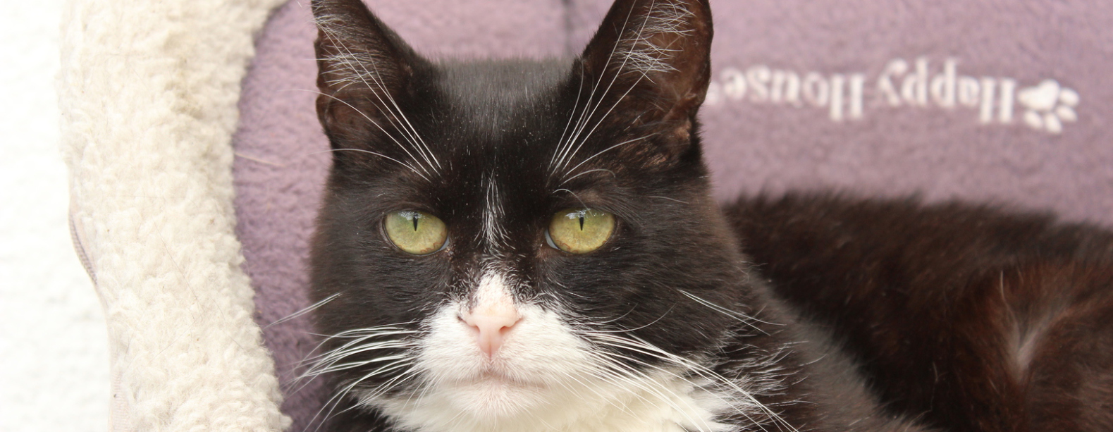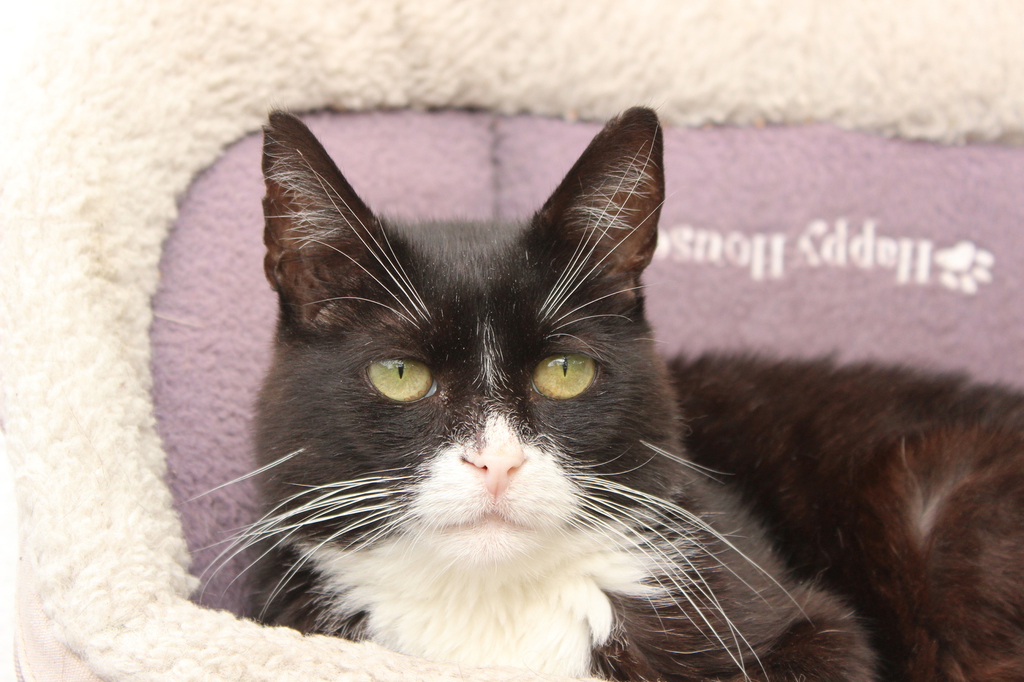 Er kam in einem sehr schlechten Zustand zu uns und wir hatten unsere Mühe ihn langsam aufzupäppeln, da er einen starken Katzenschnupfen hatte. Wir haben ihm etliche Medikamente verabreicht und irgendwann fingen wir an mit ihm zu inhalieren. Er wusste schon ganz genau im Früh- und Spätdienst im Katzenhaus, wenn wir mit dem heißen Topf Wasser um die Ecke kamen, er sprang gleich in den Katzenkorb zum Inhalieren. Er wusste mit dem Inhalieren ganz genau, dass es ihm sehr guttut.