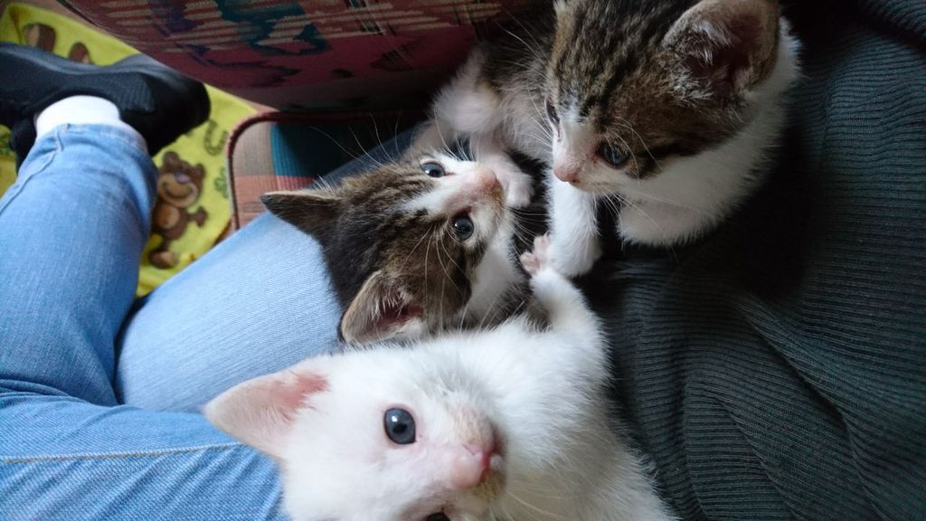Katzenkinder Frosty (weiß), Sunny (getigert, Mädchen) und Rainy (getigert, Junge)